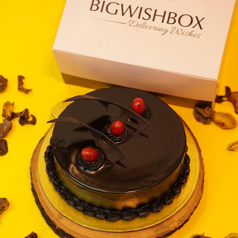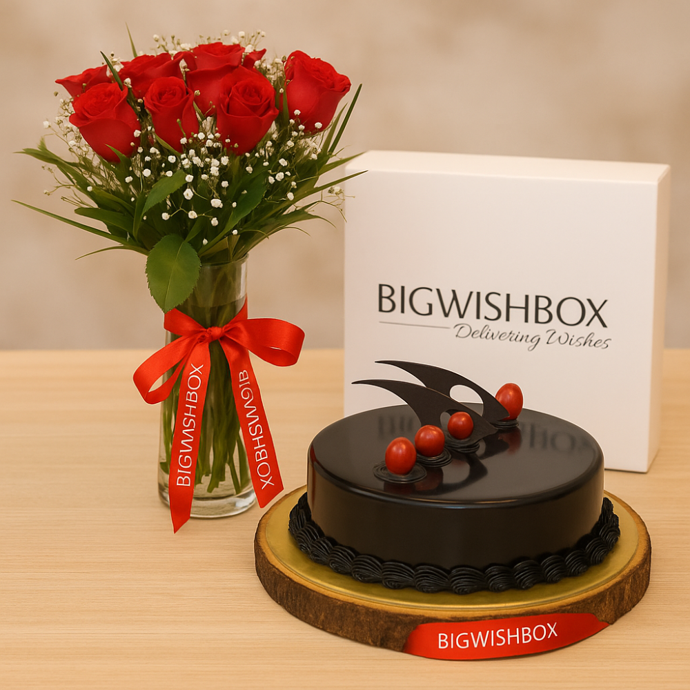 Elevate your gifting with this elegant pairing of 12 fresh red roses beautifully arranged in a vase, symbolizing love and admiration, complemented by a rich and creamy 500g Chocolate Truffle cake. Perfect for birthdays, anniversaries, or any occasion where you want to make a lasting impression with style and taste.