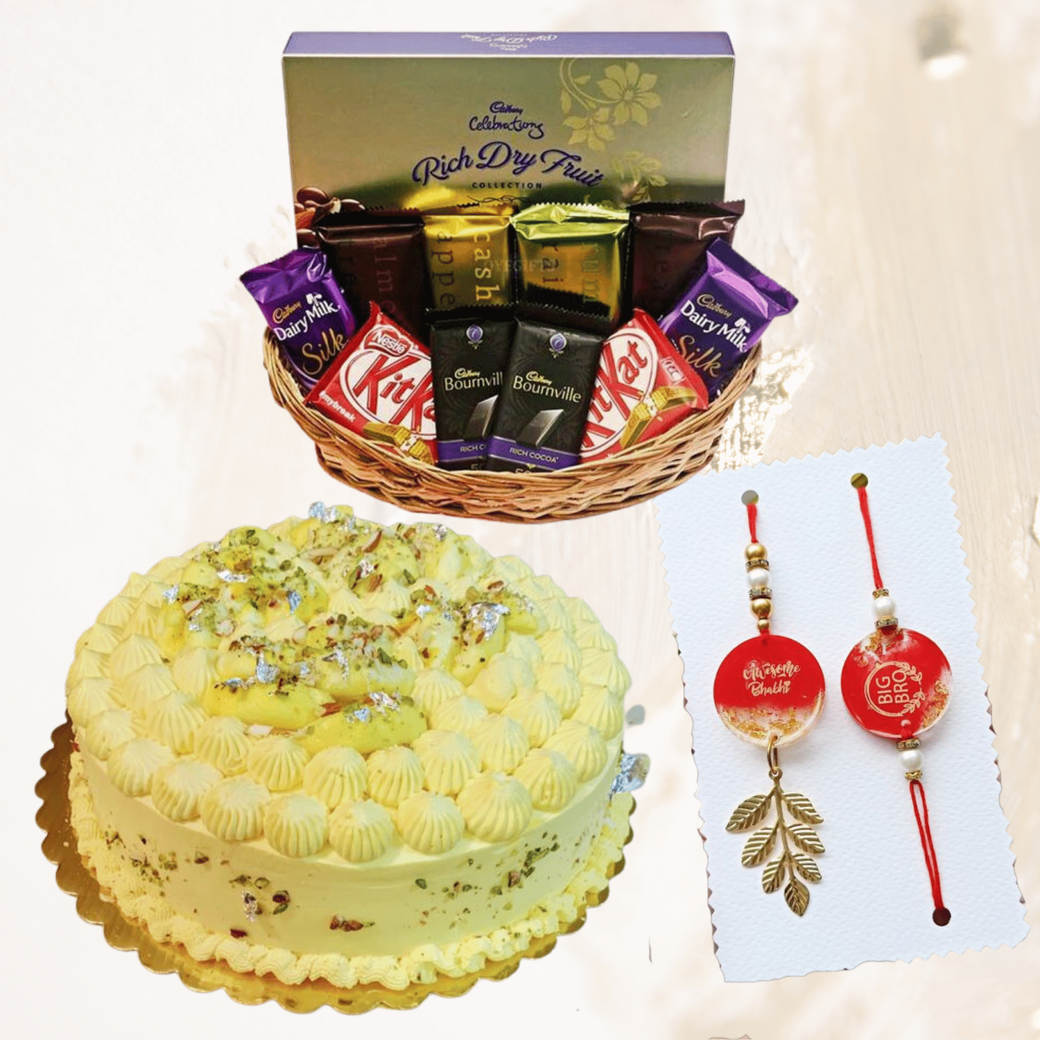 Elevate your Rakhi celebration to new heights of joy with our exquisite Rakhi package. Embark on a journey of flavors and emotions as you partake in the irresistible delights of a 1 kg Rasmalai Cake and indulge in the sweetness of sibling bonds with a Bhai Bhabhi Rakhi set, all wrapped in a charming Chocolate Basket.