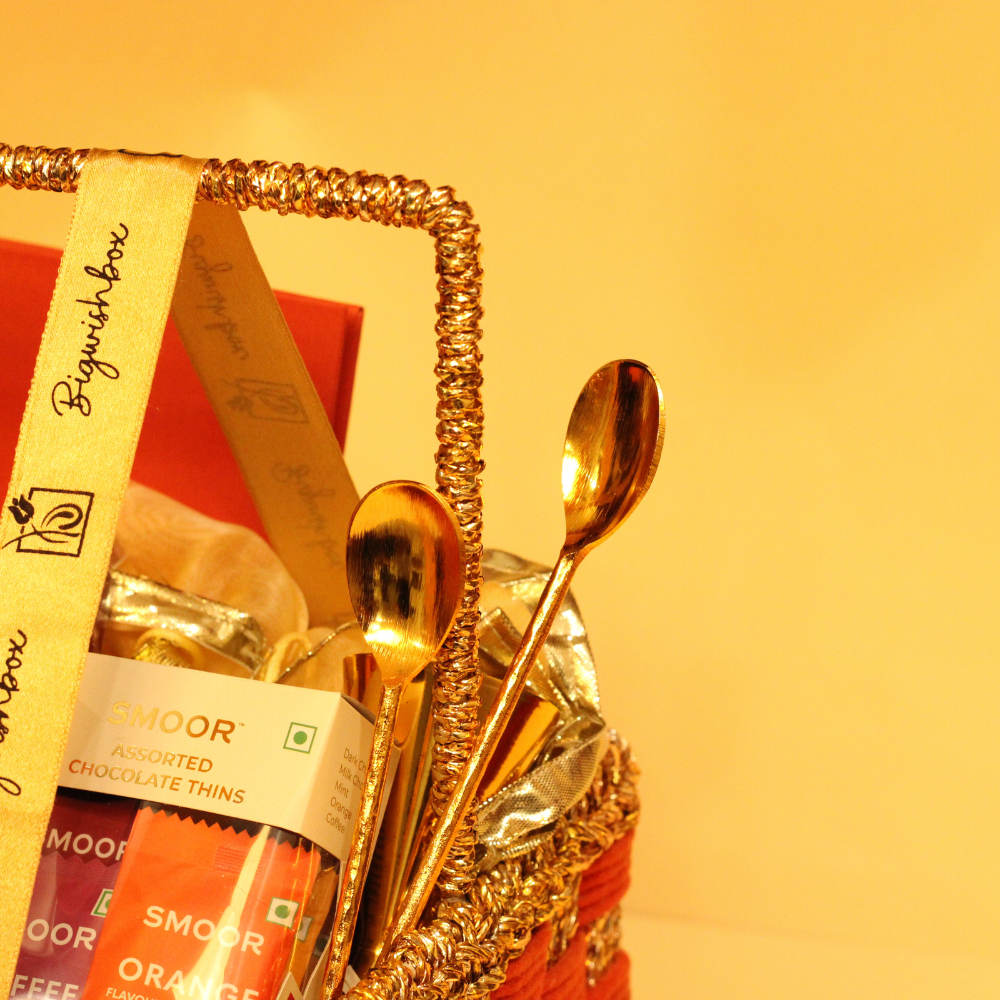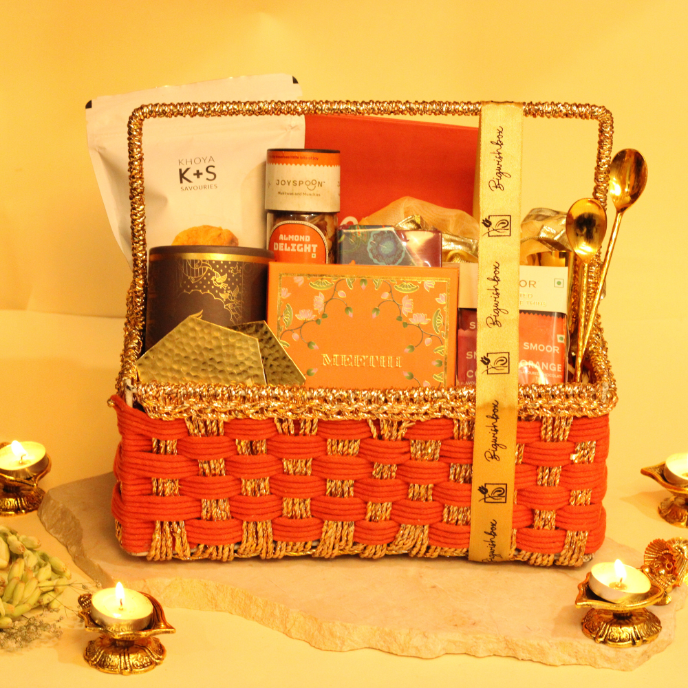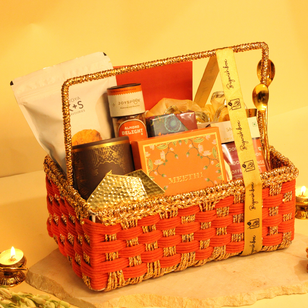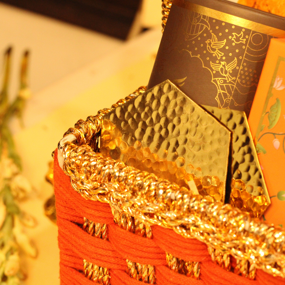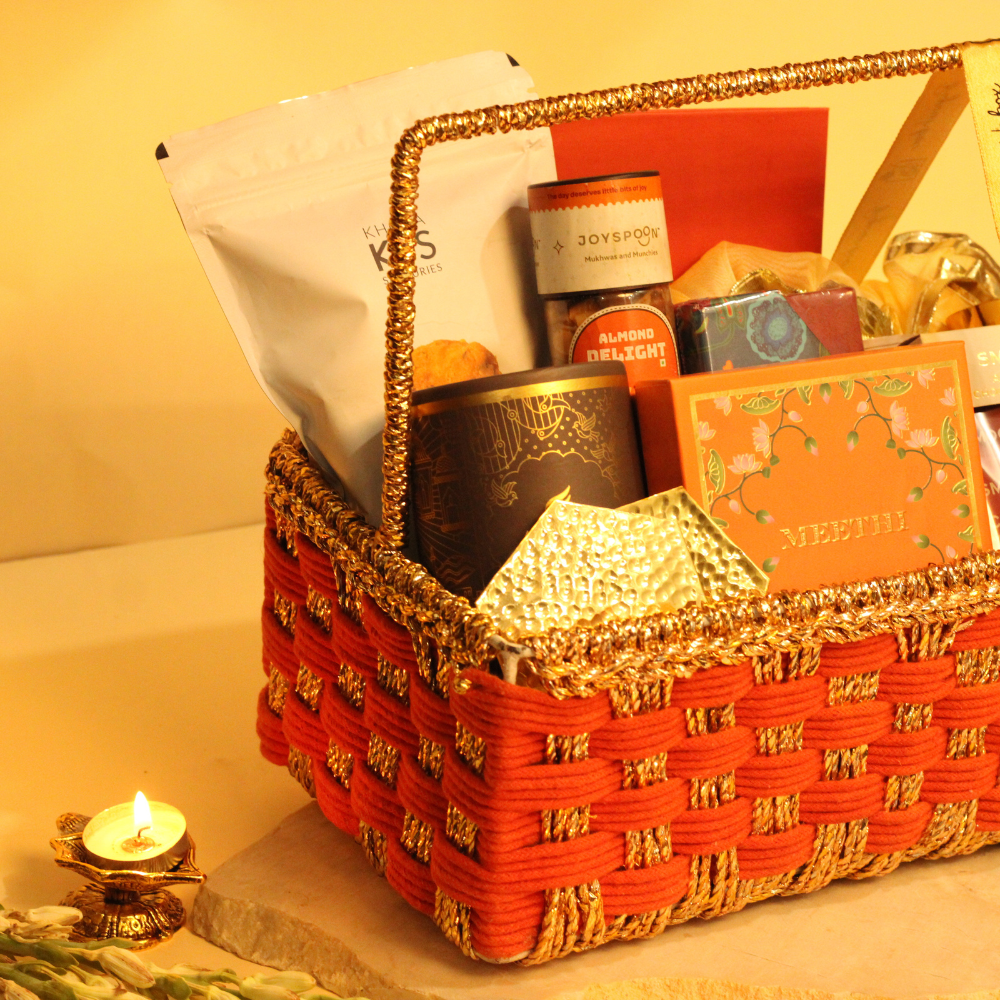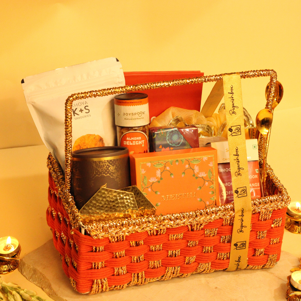 A thoughtfully designed hamper that blends festive warmth with a touch of modern luxury—ideal for Diwali, weddings, or corporate gifting. Presented in an elegant orange rope basket.
