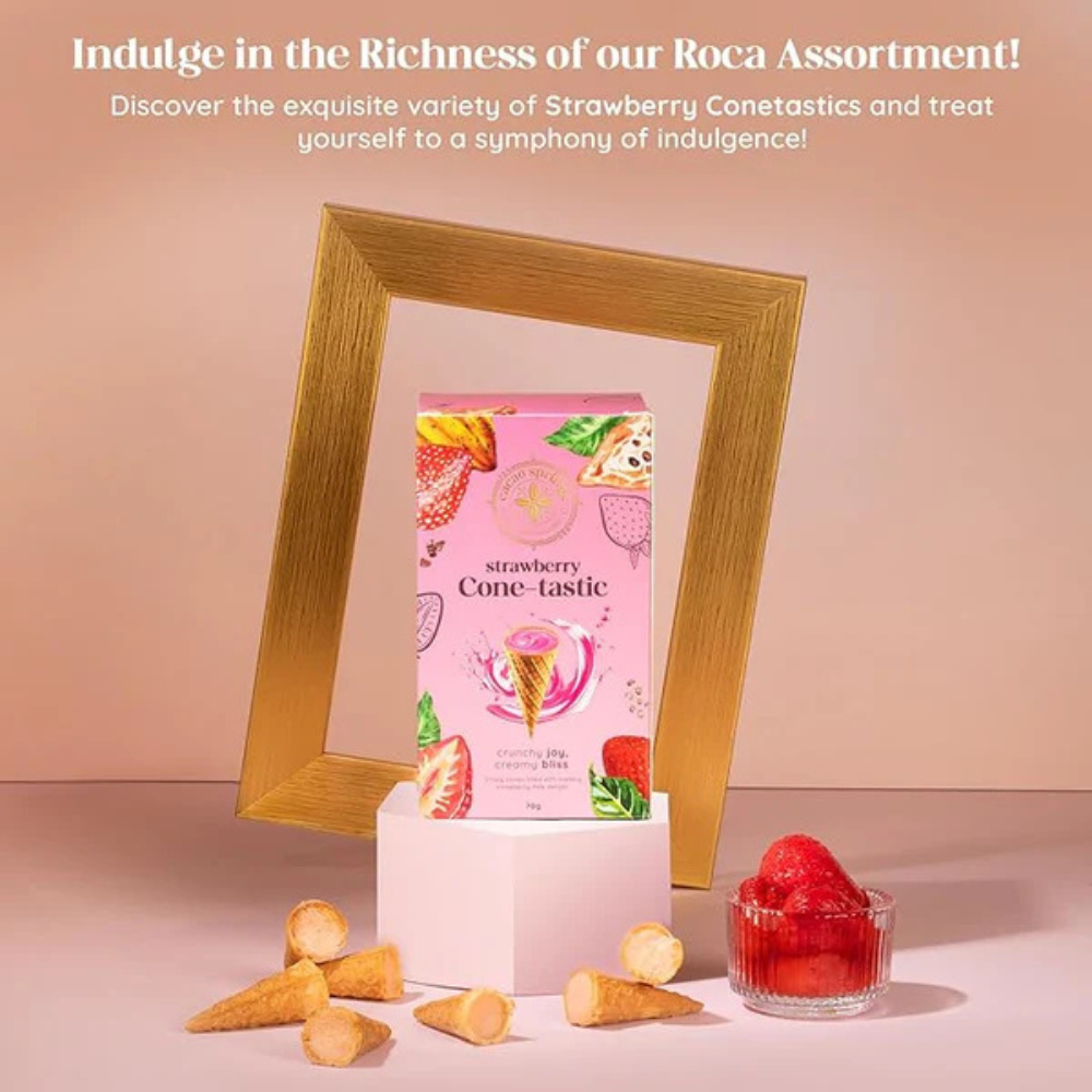 reat yourself to the irresistible crunch of Cacao Springs Strawberry Conetastic. These mini wafer cones are filled with rich chocolate, crunchy nuts, and a burst of strawberry flavor. A delightful fusion of textures, beautifully packed for gifting or snacking.
