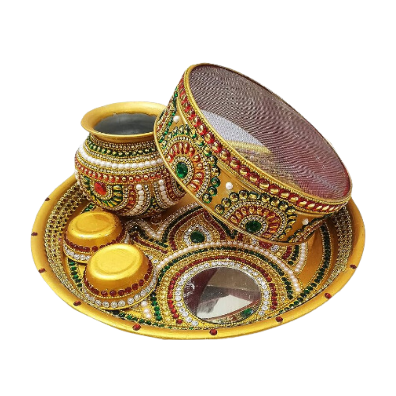 Introducing a captivating multicolored karwachauth thali set adorned with exquisite golden lace and intricate stone embellishments, complete with a channi. Crafted from durable steel, this set adds an elegant touch to your festivities. The dimensions are as follows: Thali - 11 inches, lota - 3x3 inches, diye - 2x2 inches, and channi - 7x2 inches. This stylish and ornamental multicolored karwa chauth thali set boasts a delightful design and alluring stone work. It is the ideal choice for celebrating karwa chauth and any joyous occasion. It also makes for a thoughtful gift to elevate the charm of your karwa chauth celebration. Please note that the product's color may slightly vary due to differences in screen resolutions.