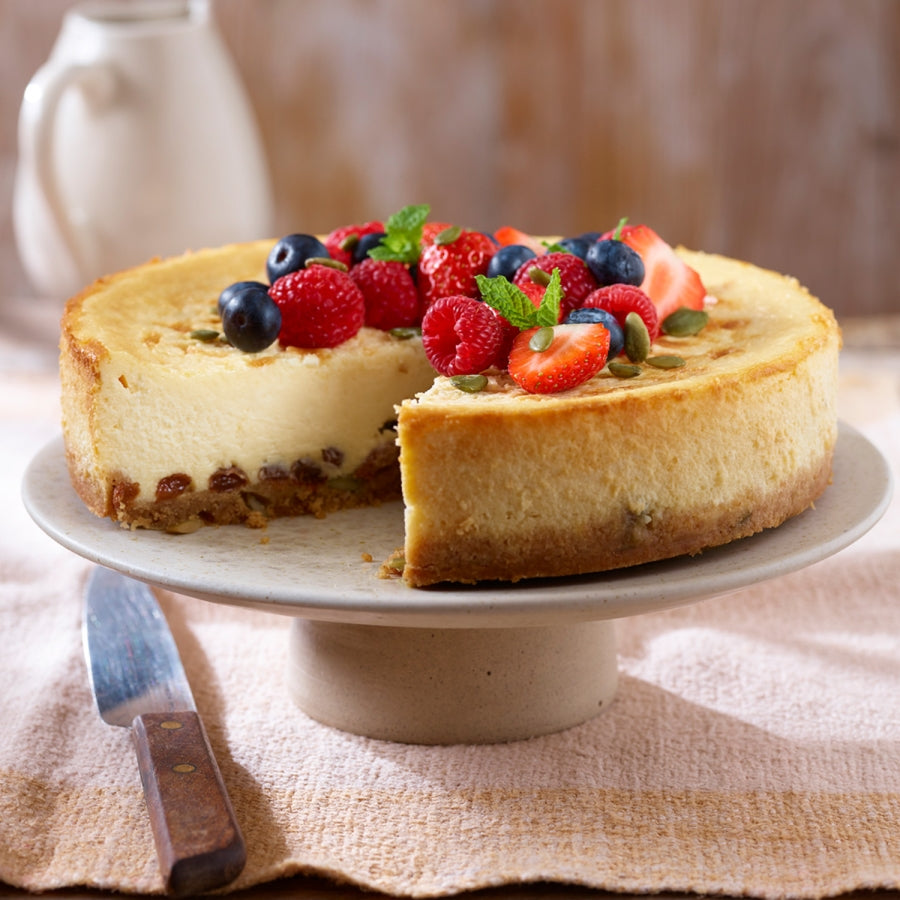 New York-style cheesecake with fresh strawberries on top is a classic dessert that is loved for its rich and creamy texture, and the delightful sweetness of ripe strawberries. The velvety smooth cream cheese filling is the hallmark of New York-style cheesecake, known for its dense and indulgent consistency.
