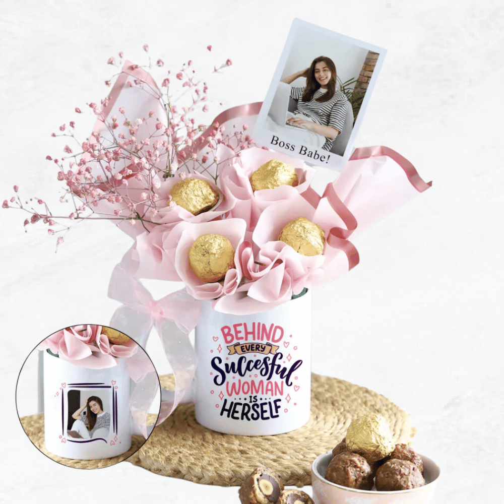 Instill even greater confidence in your beloved lady with this charming display. Crafted with care, this delightful arrangement showcases delectable nutty chocolates, elegantly presented in a pristine white mug adorned with the empowering quote, "Behind Every Successful Woman Is Herself." After relishing the chocolates, she can proudly display the mug while enjoying her preferred beverage. Customize the Polaroid with a cherished photo of the two of you together, offering her a delightful surprise that's sure to evoke a radiant smile.