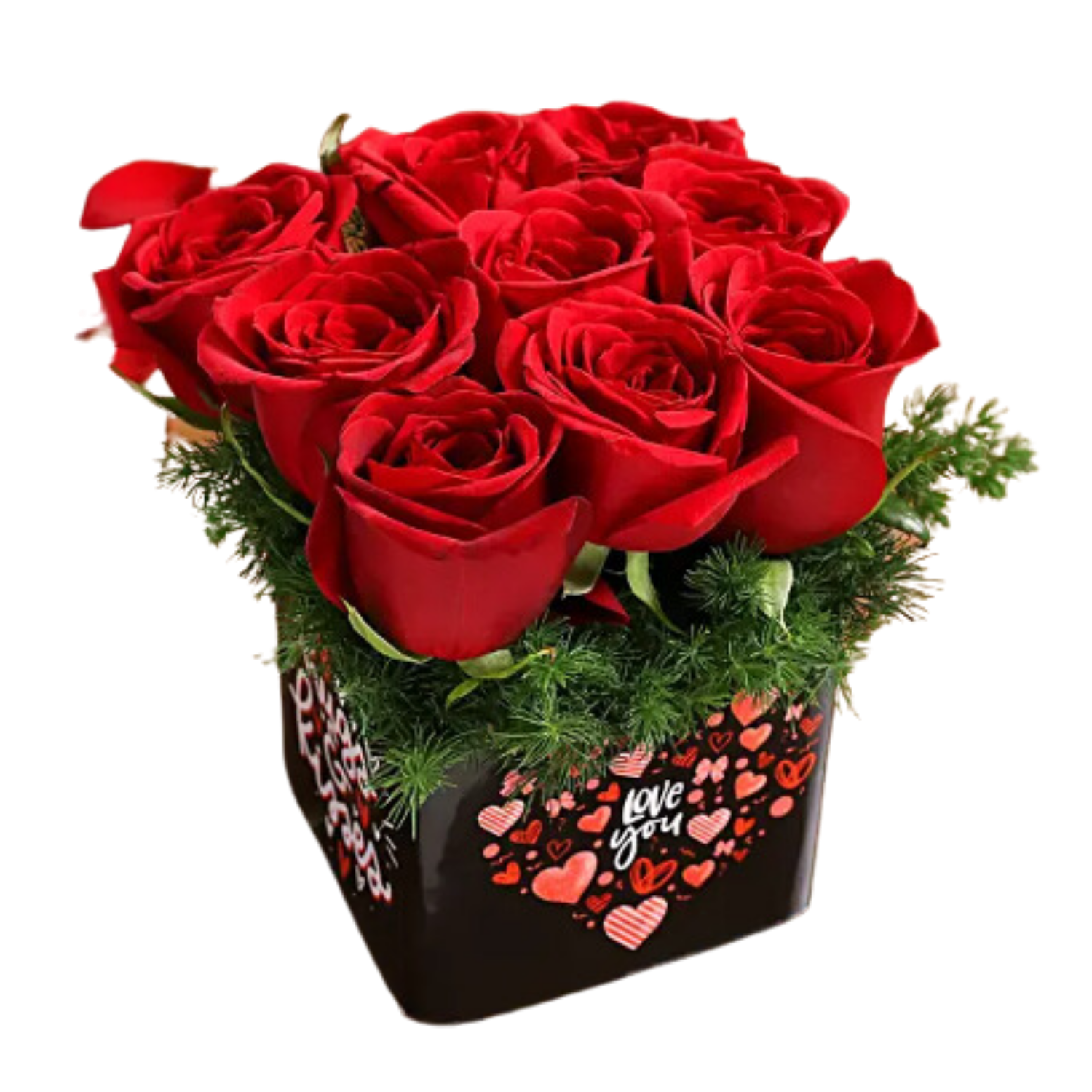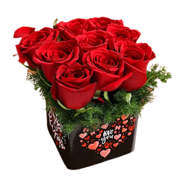 Elevate your gift-giving experience with our "Romantic Red Roses in a Glass Vase" arrangement. This stunning ensemble features nine vibrant red roses delicately paired with lush green ping pong leaf filler, all showcased in a sleek 4x4 inch transparent square glass vase. To add a touch of personalized affection, a black "Love You" printed peel-off sticker graces the vase.