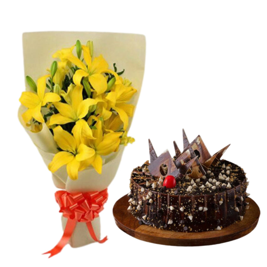 Sending a bunch of 5 yellow lilies with a half kg chocolate marble crunch cake is a beautiful way to show someone special how much you care. The bright yellow lilies symbolize friendship and happiness, making them the perfect choice for a cheerful and uplifting gift.